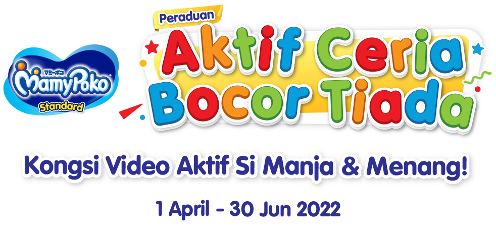 Rakam, hantarkan aksi comel Si Manja bersama lampin MamyPoko standard, muat naik di Facebook, tag MamyPoko Malaysia dan gunakan #AktifCeriaBocorTiada