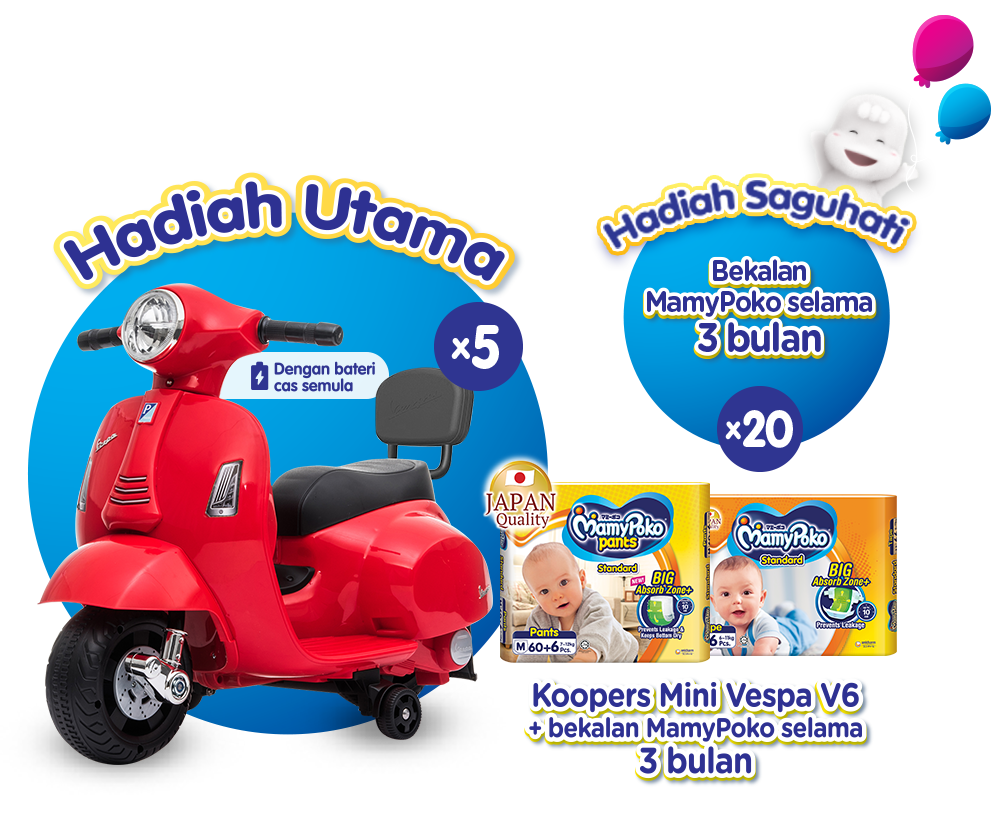 - Hadiah Utama adalah Koopers Mini Vespa V6 dan bekalan MamyPoko Standard Pants/Tape selama 3 bulan x 5 pemenang. Jenis MamyPoko Pants/Tape dan kuantiti yang akan diberikan adalah atas budi bicara Penganjur sepenuhnya.